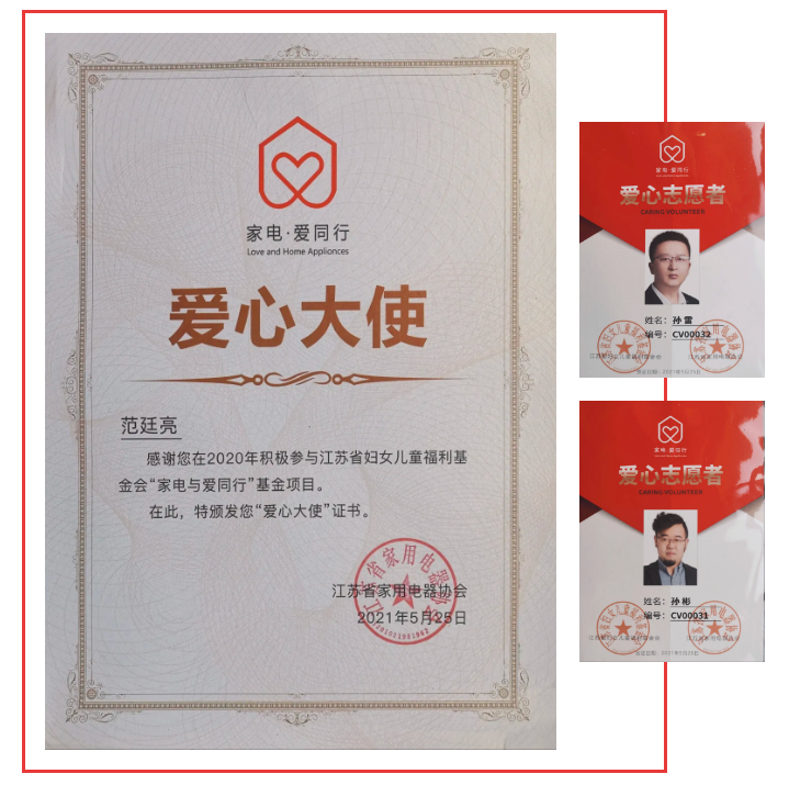 頒獎環(huán)節(jié),江蘇省家用電器協(xié)會對2020年度積極參與江蘇省婦女兒童基金會“家電與愛同行”基金項目各類活動的愛心人士授予了“愛心大使”、“愛心志愿者”榮譽稱號。“家電與愛同行”慈善基金聯(lián)合發(fā)起單位、基金會理事長、LEASY領(lǐng)致總經(jīng)理范廷亮先生榮獲“愛心大使”稱號,感謝他在2020年積極參與江蘇省婦女兒童福利基金會“家電與愛同行”基金項目。同時獲得表彰的還有AO.史密斯邱步、天加環(huán)境齊家沖、明珠集成顧鴻洋等14位“愛心大使”。
