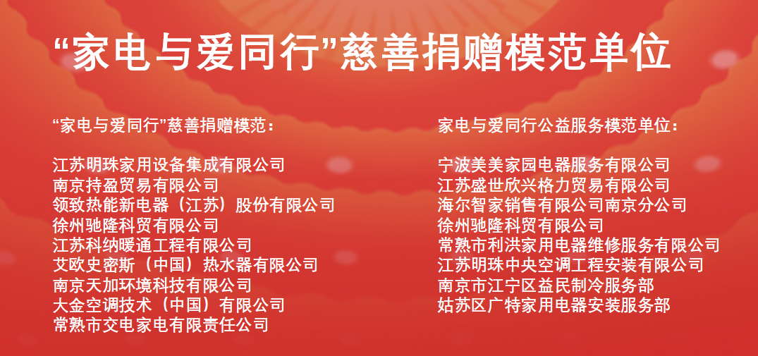公益于心,至善至美,大愛無疆!LEASY領(lǐng)致、明珠家電、艾歐史密斯、天加環(huán)境、大金空調(diào)、持盈貿(mào)易、科納暖通、馳隆科貿(mào)、常熟交電等被江蘇省家用電器協(xié)會評為:“家電與愛同行慈善捐贈模范企業(yè)”!